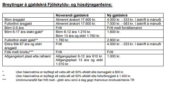 Breytingar á gjaldskrám sundlauga Reykjavíkurborgar, Ylstrandarinnar og Fjölskyldu- og húsdýragarðsins voru samþykktar í borgarstjórn 14. apríl sl. Í Fjölskyldu- og húsdýragarðinum mun stakt gjald hækka en verð árskorta lækka umtalsvert auk annarra breytinga sem sjá má í meðfylgjandi töflu. Breytingarnar taka gildi 5. maí nk. Sjá nánar í frétt á vefsíðu Reykjavíkurborgar.